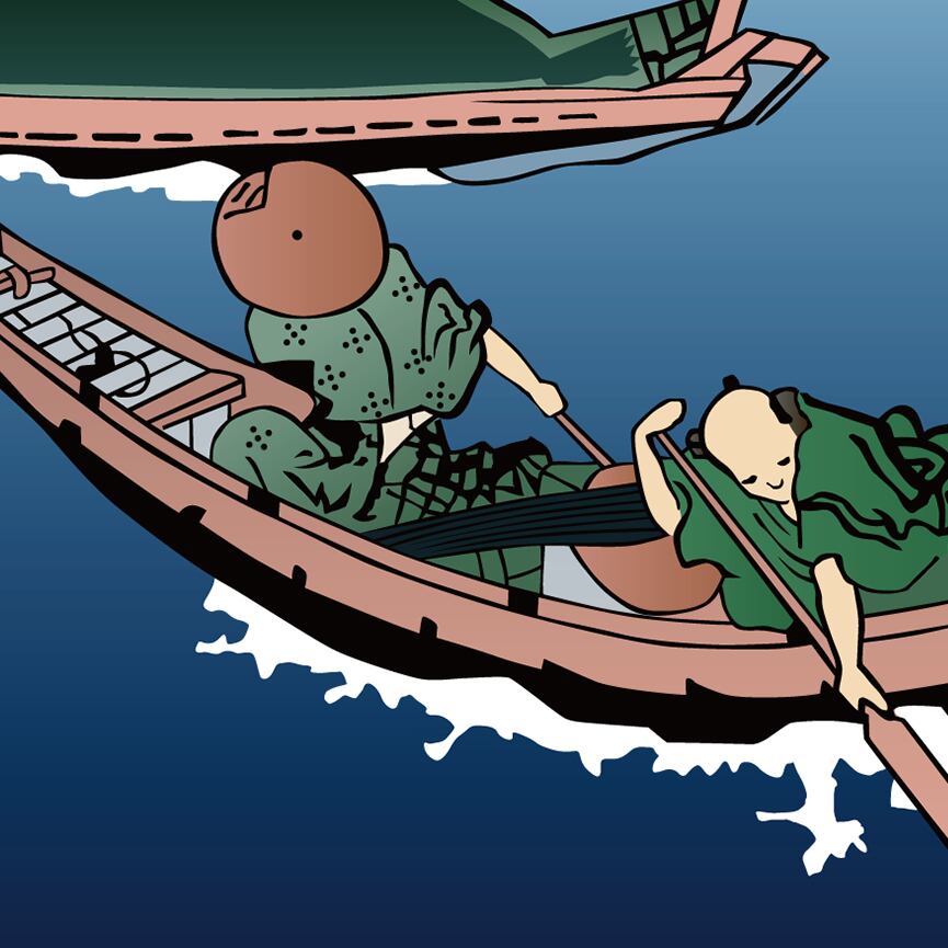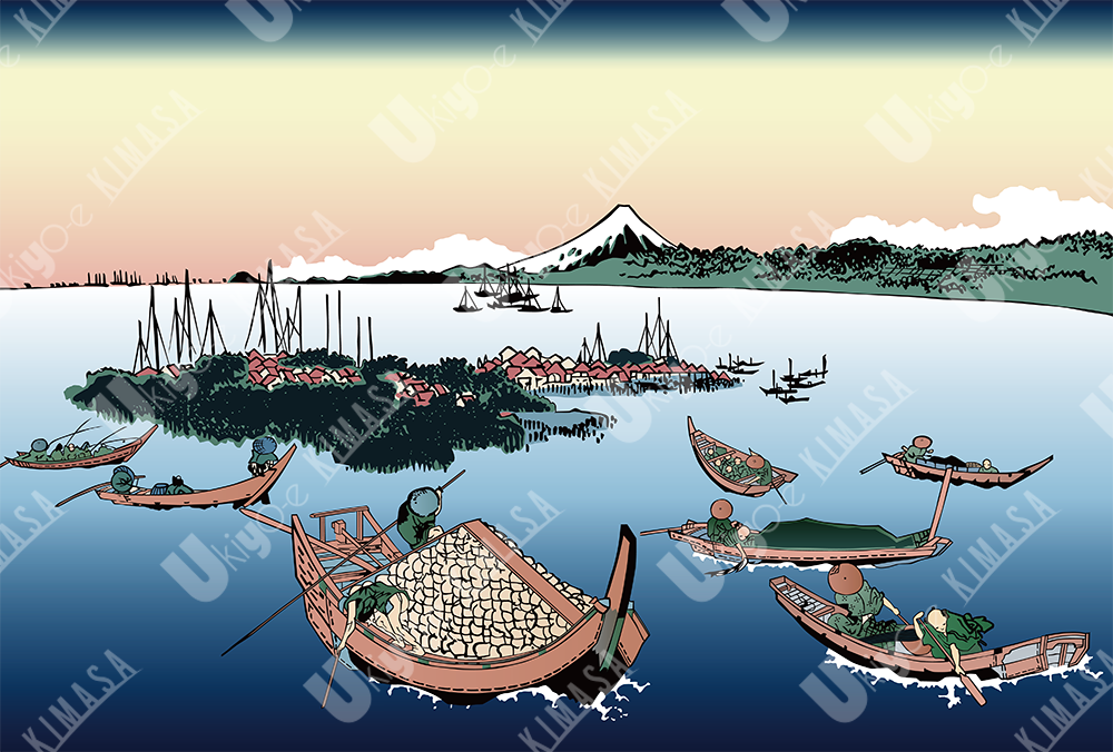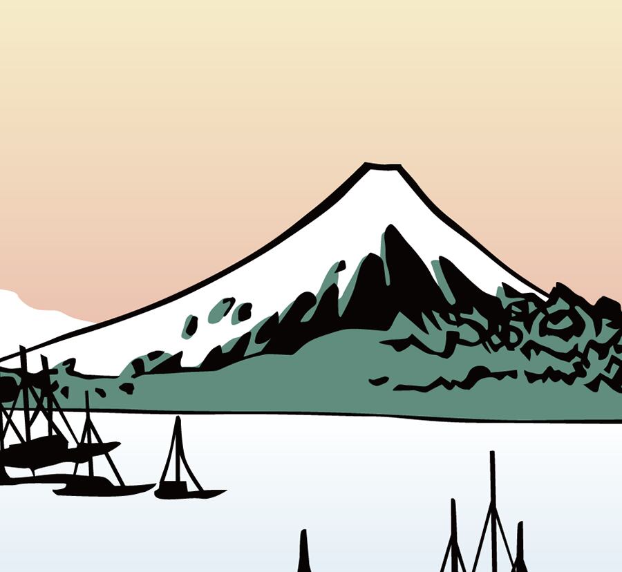 with boats, shoreline activity, and Mount Fuji in the distance—
