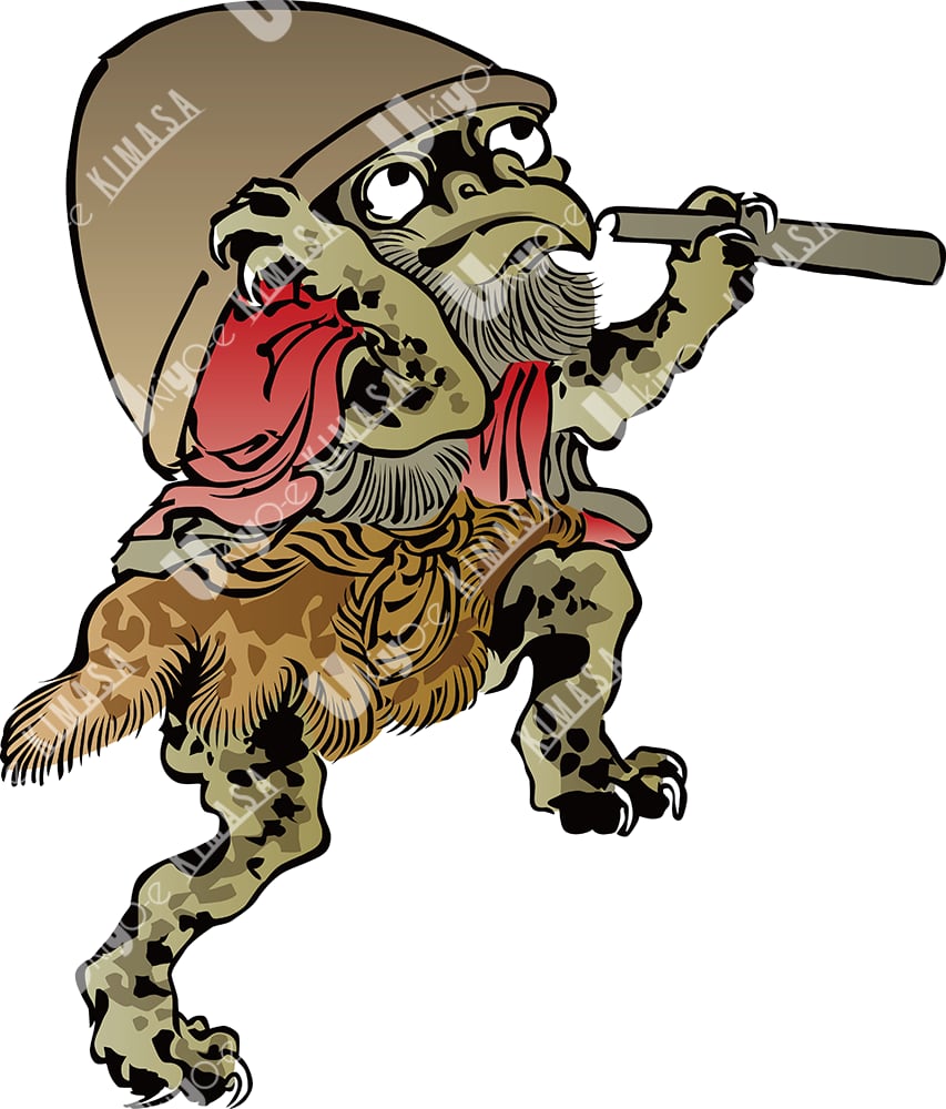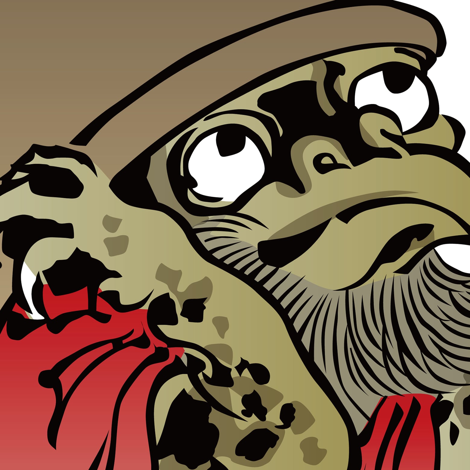 Bakegaeru on a Pilgrimage depicts a yokai frog traveling the roads,