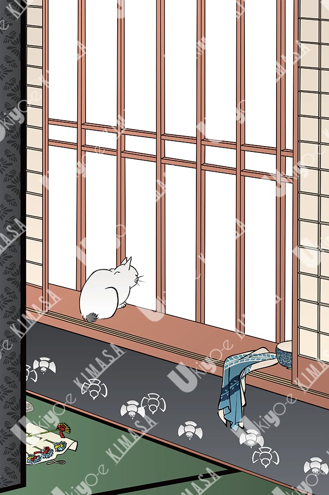 A Cat at the Doorway depicts a quiet moment at the threshold of an interior space,