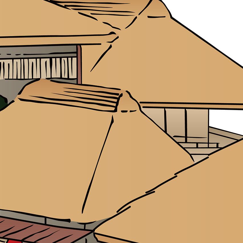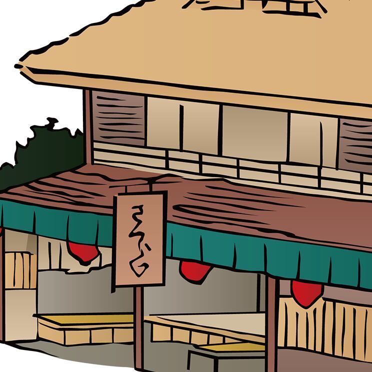 This artwork depicts a row of traditional thatched-roof houses, reconstructed from classic Japanese rural architecture and refined as a modern design asset with a calm, balanced composition.