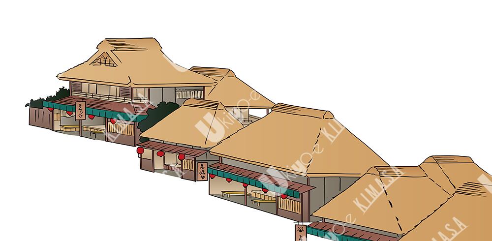 茅葺き屋根の家並み
