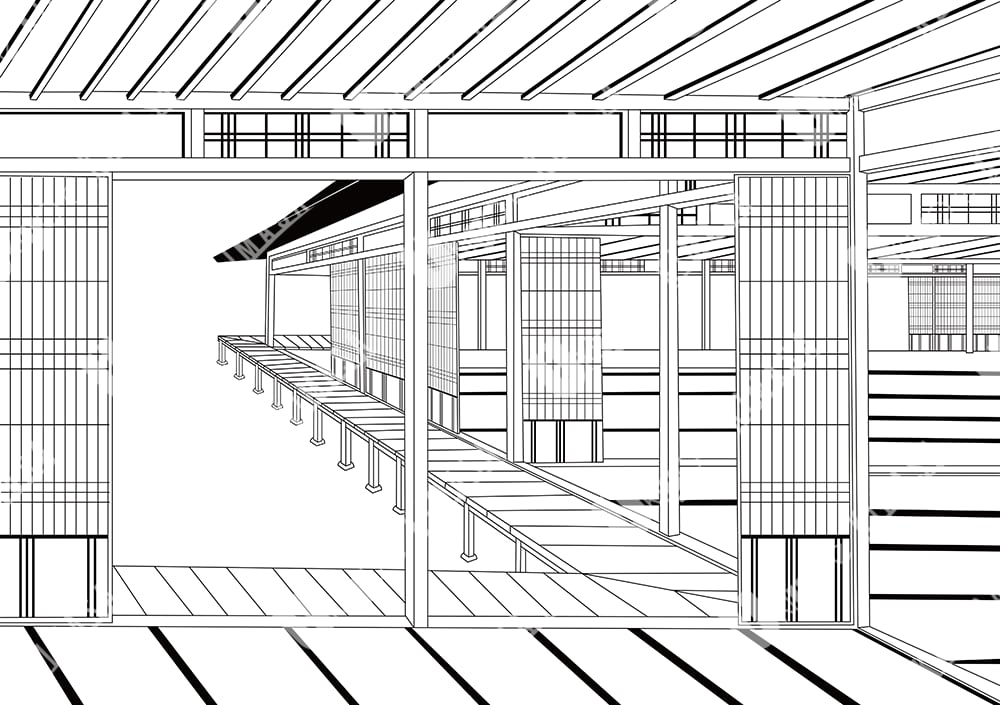 This black-and-white version portrays an empty engawa,