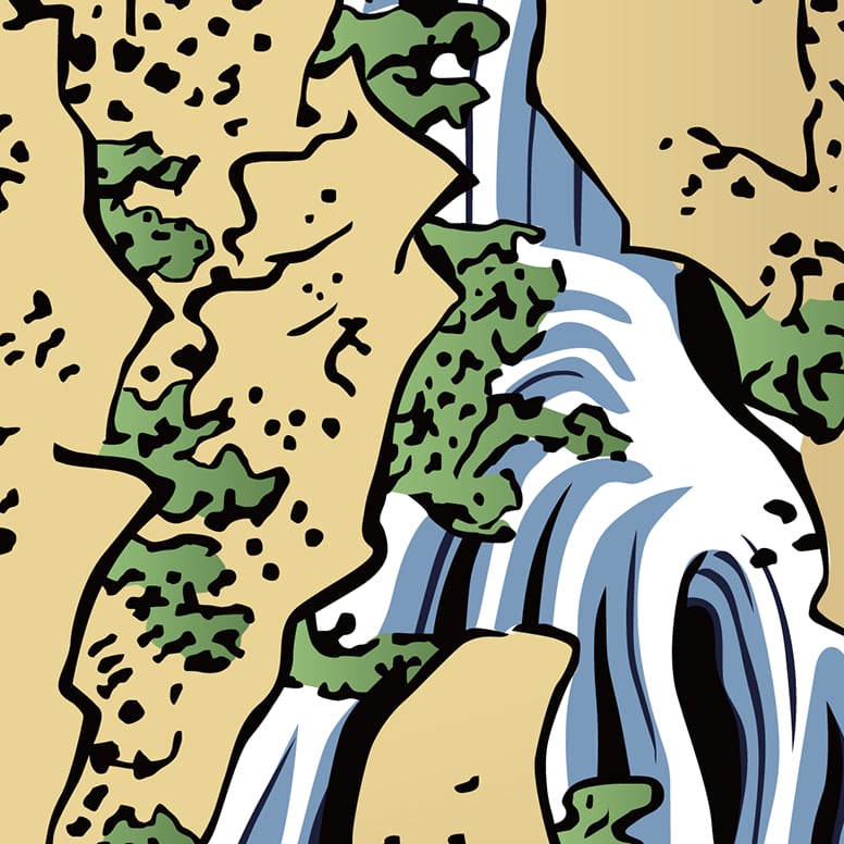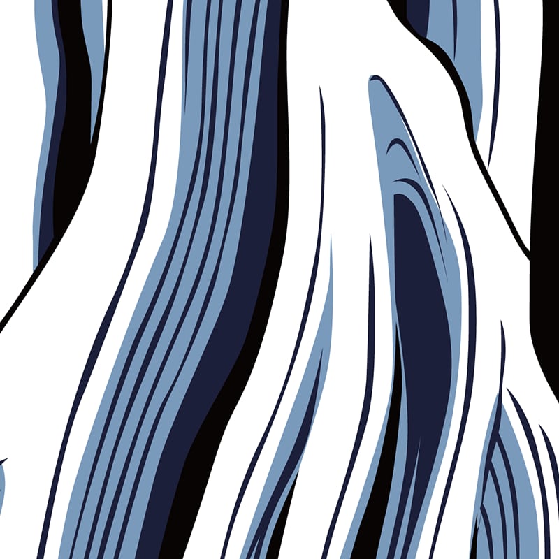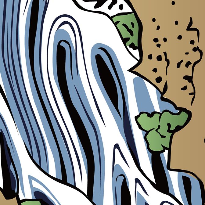 The composition emphasizes vertical movement and layered streams,