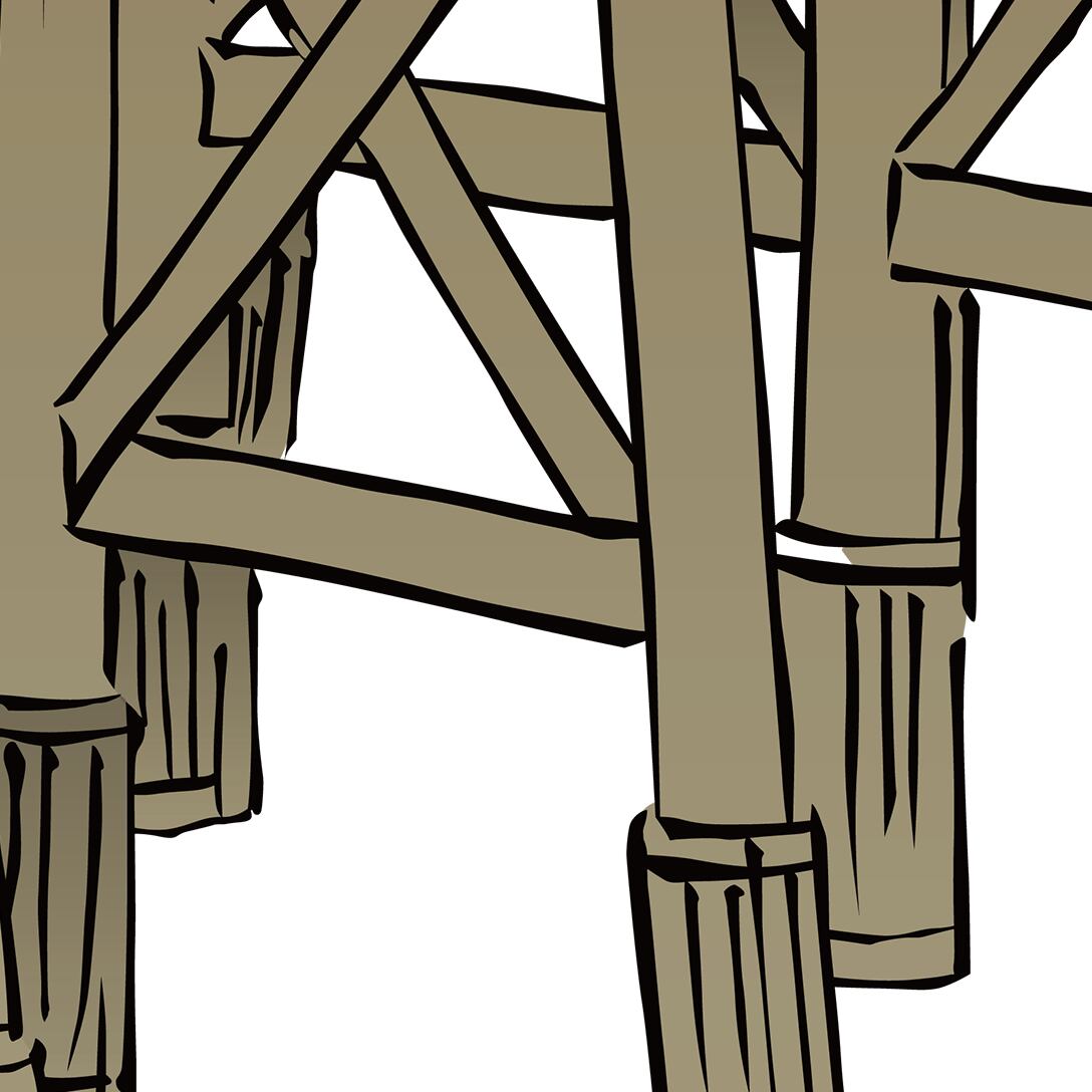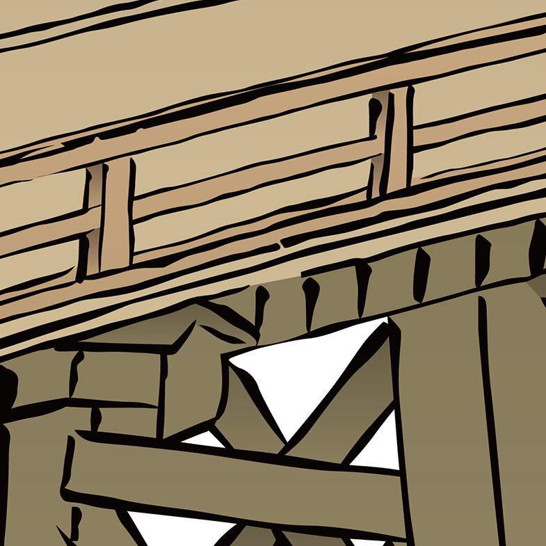This composition focuses on the structure of a wooden bridge,