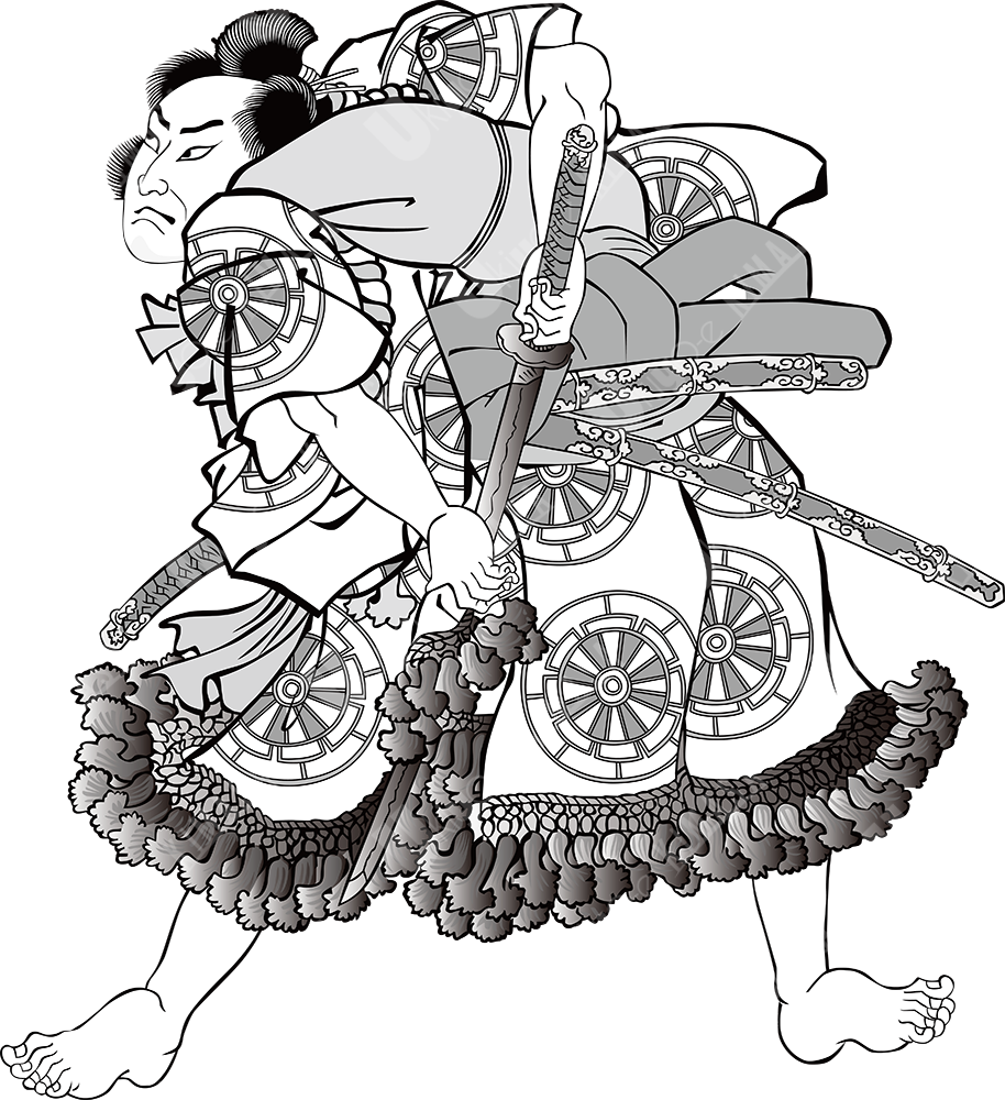 This monotone artwork is a modern vector reinterpretation of a traditional Musha-e ukiyo-e motif.