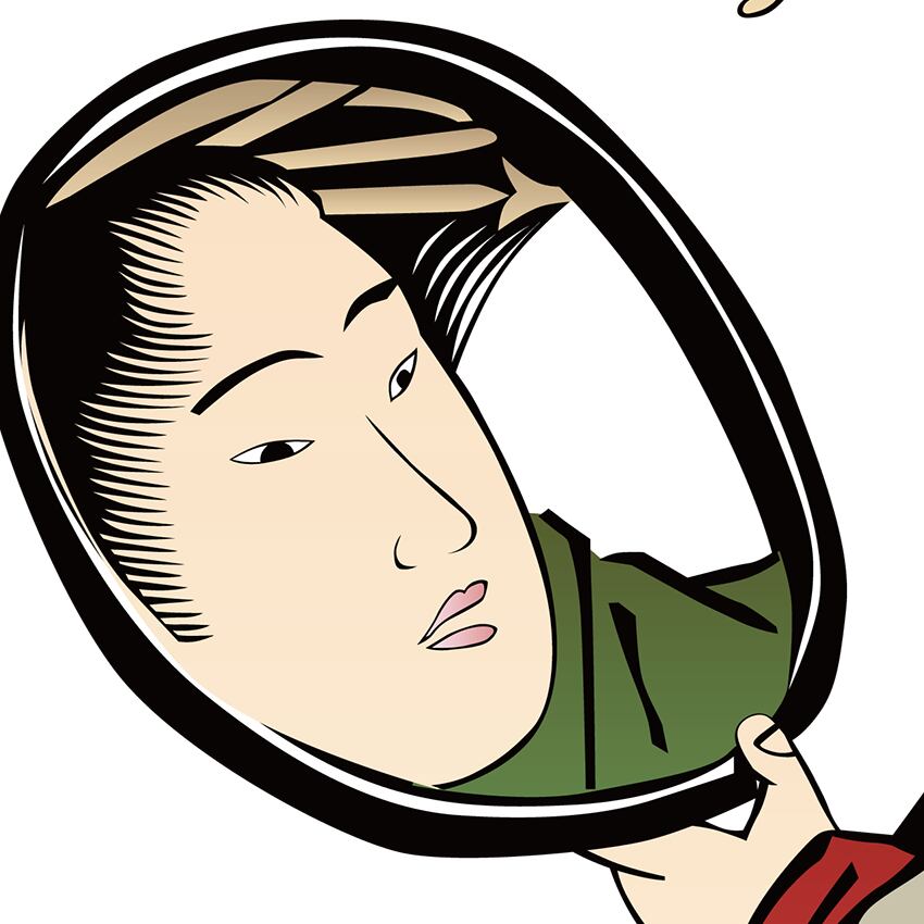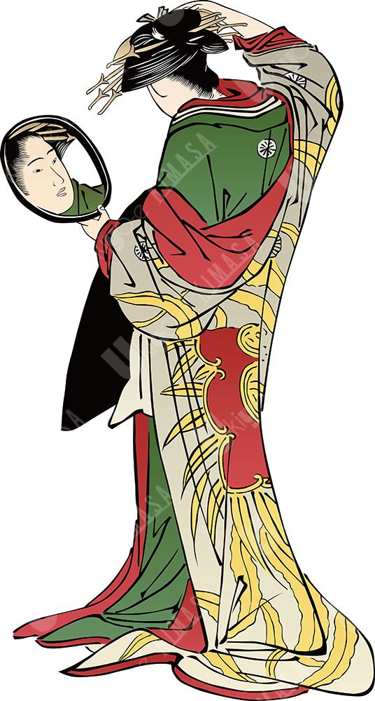 手鏡をもつ女性の後ろ姿