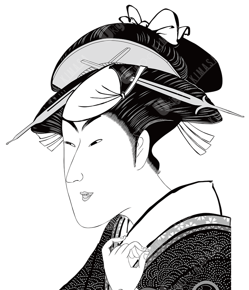 A monotone illustration of a woman in a kimono,